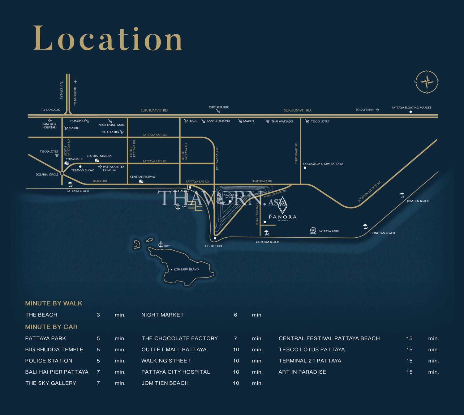 Located on Pratumnak Hill Soi 5, just 250 meters from the beach, which is the only alley on Pratumnak Hill that can access this beach. Khao Phra Tamnak is the only mountain located between Pattaya Beach and Jomtien Beach The project has complete facilities, including Swimming Pool, 4th floor, INFINITY SKY POOL, 29th floor, sky garden 720 sq.m., Fitness, Sauna, Kid Room, Sunken Blue and Sunken green. Go to various places in Pattaya easily, such as Walking Street, Bali Hai Pier, View Point, Sor.Thor.5, Khao Phra Yai Temple, Central Festival Pattaya and other places. which is not far from the project The Panora Pattaya